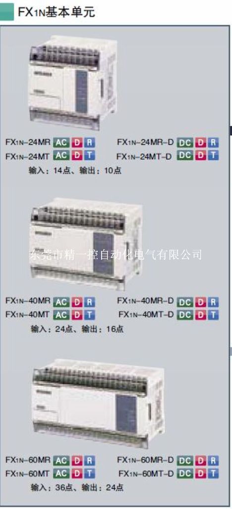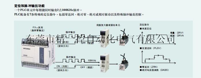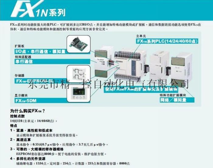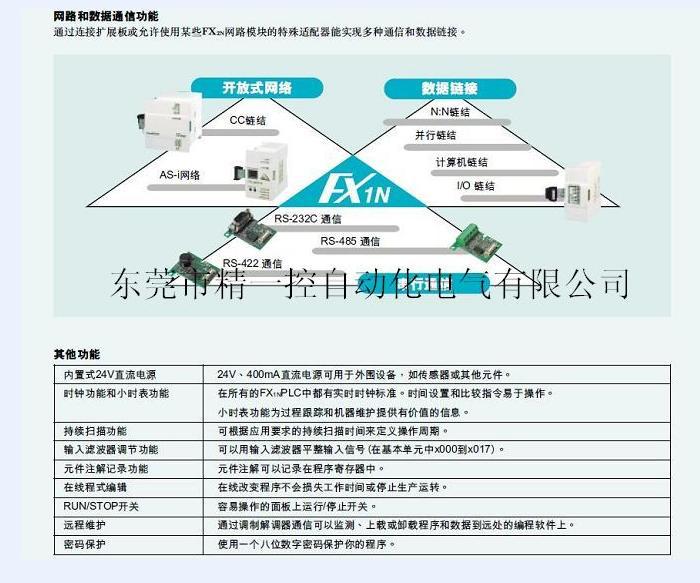 简单介绍 | FX1N系列是功能很强大的微PLC,可扩展到多达128 I/O点,并且能增加特殊功能模块或扩展板。通信和数据链接功能选项使得FX1N在体积、通信和特殊功能模块等重要的应用方面非常完美。 | 定位和脉冲输出功能 | 一个PLC单元能同时输出2点100KHz脉冲,PLC配备有7条特殊的定位指令,包括零返回、绝对位置读出、绝对或相对驱动以及特殊脉冲输出控制。 |