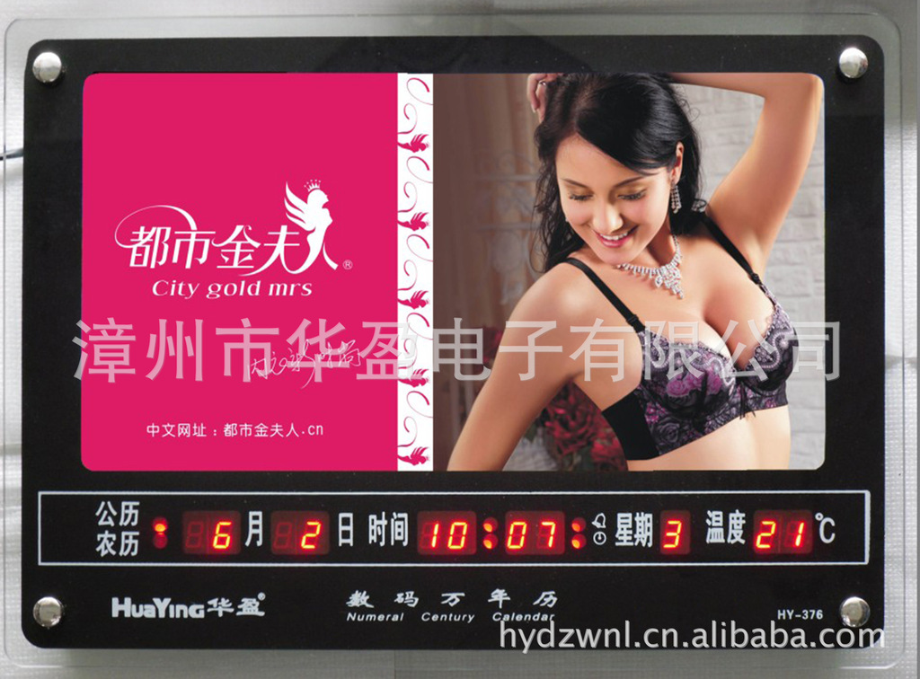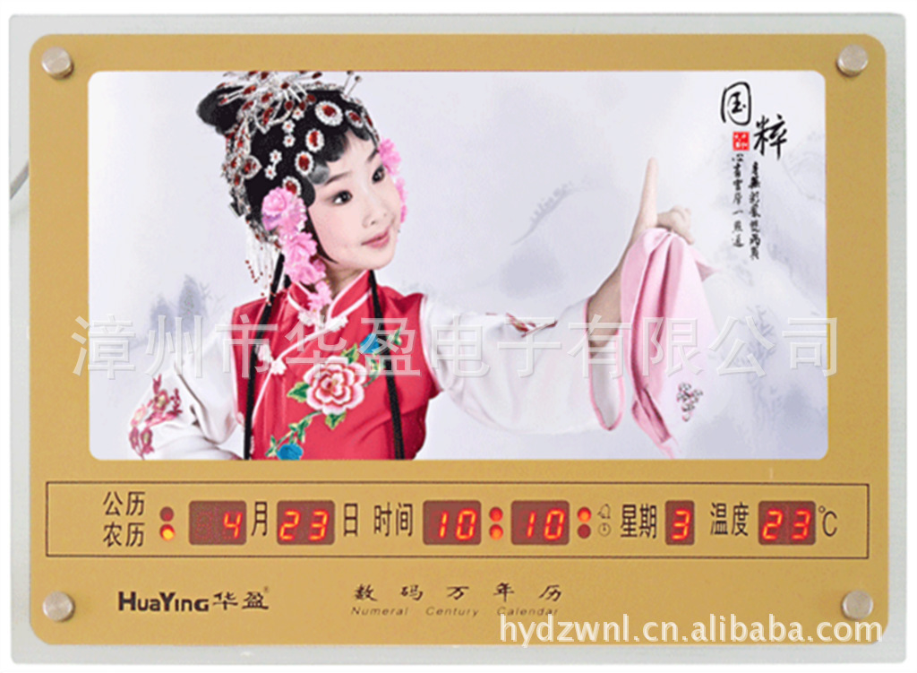 “华盈”牌数码万年历品种繁多,计时精确,它能显示公历,农历,星期,气温,时,分,秒,二十四节气功能,语音报时四种定闹功能,产品操作方式简单,修改方便,“华盈”数码万年历是现代家庭办公室、银行、机场、酒店工厂等单位最理想的信息产品。