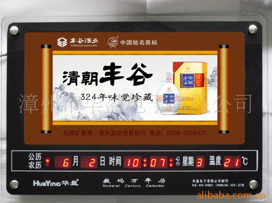 “华盈”牌数码万年历品种繁多,计时精确,它能显示公历,农历,星期,气温,时,分,秒,二十四节气功能,语音报时四种定闹功能,产品操作方式简单,修改方便,“华盈”数码万年历是现代家庭办公室、银行、机场、酒店工厂等单位最理想的信息产品。