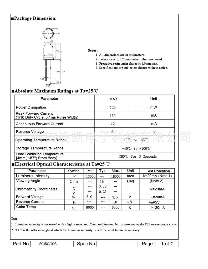 广州市连凯电子科技有限公司是一家专业生产LED发光二极管的生产厂家,拥有全自动生产设备,全自动分光分色机,产量大,长期稳定供货、质量稳定可靠,价格优惠!长期为客户提供各种规格型LED,具体规格参数如下:规格:5MM白光角度:15-30度亮度:8000-10000,10000-13000,13000-16000MCD电压:3.0-3.2V,3.2-3.4V