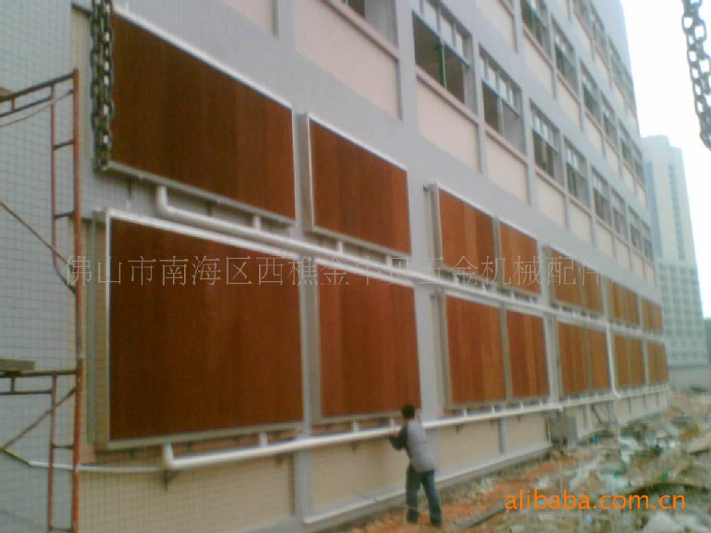 金牛贝(Genlubull)水帘墙外框有铝合金和不锈钢多种材质,上进水下面回水口,接循环管道系统,配套金牛贝(Genlubull)风机使用可以使厂房(室內)温度降到30度以下。
