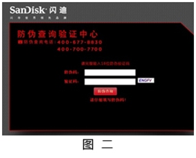 SanDisk闪迪产品真伪验证方式 1. 拨打SanDisk闪迪官方防伪验证电话:400-700-7700,进行在线人工查询。 2. 登陆SanDisk官方防伪验证网站:输入产品外包装中文标贴(图一)指示的防伪码和网站(图二)提供的验证码进行查询。 |
