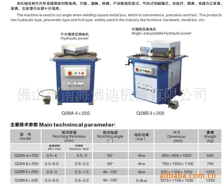 我公司生产的液压剪角机分为可调角度(45-135°)和固定角度(90°)两种。适合于各类五金剪角加工需要,剪切精度高,误差小,刀位间隙可调,剪切后的工件表面无毛刺。本设备外形美观,体积小,操作简单,维修方便,保修一年,终身维护。