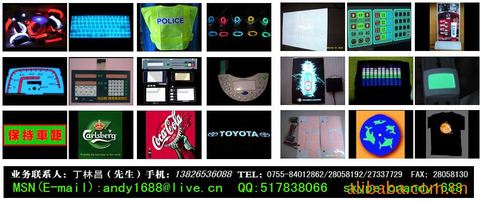 EL冷光片是光电行业较为新潮的高科技固态产品,其本身具有超薄、可弯曲、功耗低、不产生热量和紫外线、亮度均匀、色彩鲜艳等诸多性能是其它光源不可替代的优势。EL冷光片寿命长、光线柔和. EL冷光片能闪动发光、色彩丰富、图案逼真、制作精美等艺术视觉效果,因而被广泛应用于不同各大行业。