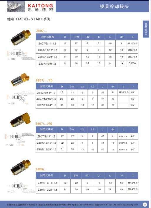 其产品主要有:快速接头,喉塞,隔水片,日期章、锁模扣、限位夹、气顶、模具计数器,导柱导套等