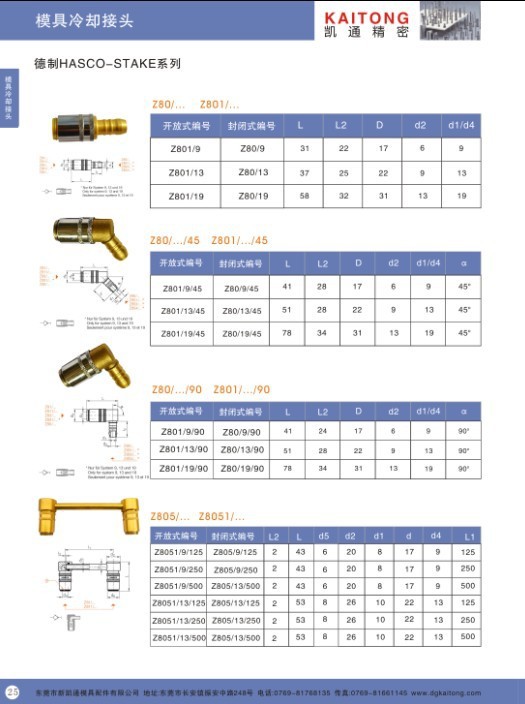 其产品主要有:快速接头,喉塞,隔水片,日期章、锁模扣、限位夹、气顶、模具计数器,导柱导套等