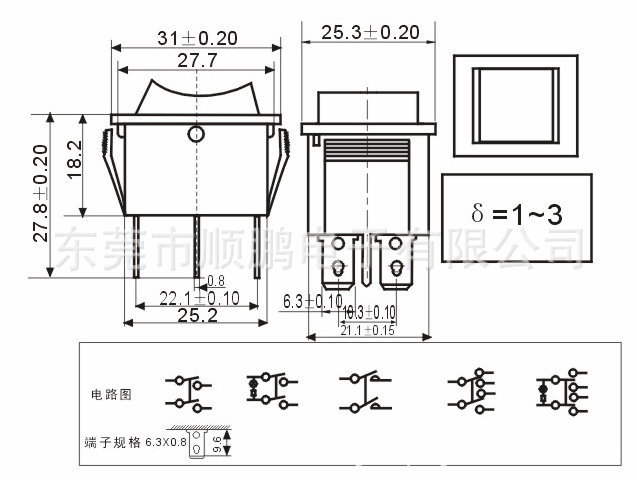·特征:触点间际在于3mm,满足欧盟安全标准.轻而有节奏的操作感.多种类型端子和端子组合供选择.一按即装的特性.·用途:广泛应用于各种小家电、汽车电子设备、医疗设备、美容设备、打印机、传真机、灯饰品及其它电子领域.·规格说明:耐高压:AC 2000V (50-60HZ) 1min 焊接温度:260±5°5s 机械寿命:50,000 cycles Min 电气寿命:10,000 cycles Min 适用温度:-25 ℃ to 85 ℃ 适用湿度:85% RH