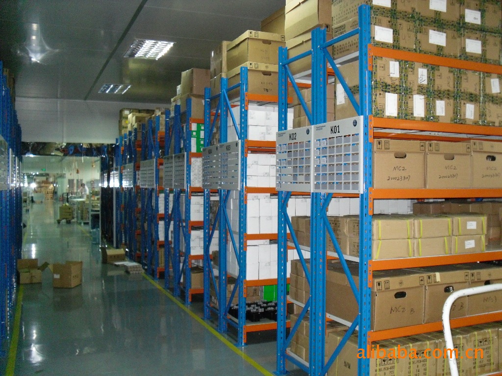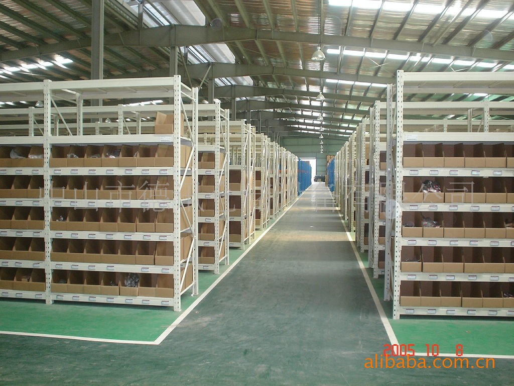中量型货架主要由立柱、横梁、托板和层板组成,主要特点为无螺栓连接,组装、拆卸简便(仅需要橡皮锤就可以进行组装/拆卸),外形美观大方,适用于人工存取货物情况,承载能力通常为200KG—350KG/层,可以满足大部分使用要求。主要部件层板为冷板板金而成,可以按50mm步距自由上下调整,为便于操作人员存取货物,货架总高度通常不超过2米,如果使用登高设备,货架高度最多可以达到3米。可单独使用,也可自由拼接成各种排列方式。适用于人工存取货物情况,成本低、安全可靠、组装、拆卸简单的特点、可单独使用,也可自由拼接成各种排列方式。 两根立柱由横撑、斜撑以尼龙自锁螺栓连接而成,可以有效防止螺栓松动后引发货架失稳;横梁杆采用特制的冷轧P型闭口梁,这种结构具有简单可靠、重量轻,承载力强,造价低的特点。柱卡与立柱连接时配有特殊设计安全销;可以确保横梁在外力撞击后不会脱落;采用国际上最流行的条状层板,具有承载能力强、耐磨损、更换简单、维护成本低廉的特点。