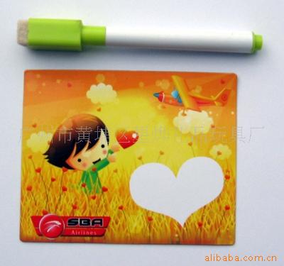 4)磁性留言板 白板:采用软胶磁铁(或纸板)+铜版纸四色印刷裱光膜+可擦笔