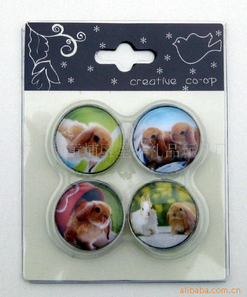 11)玻璃冰箱贴:采用下面软胶磁铁+上面铜版纸彩色印刷+半圆玻璃窗腹膜制作而成