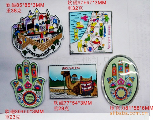 1)磁性冰箱贴:采用下面软胶磁铁+上面铜版纸彩色印刷腹膜制作而成。