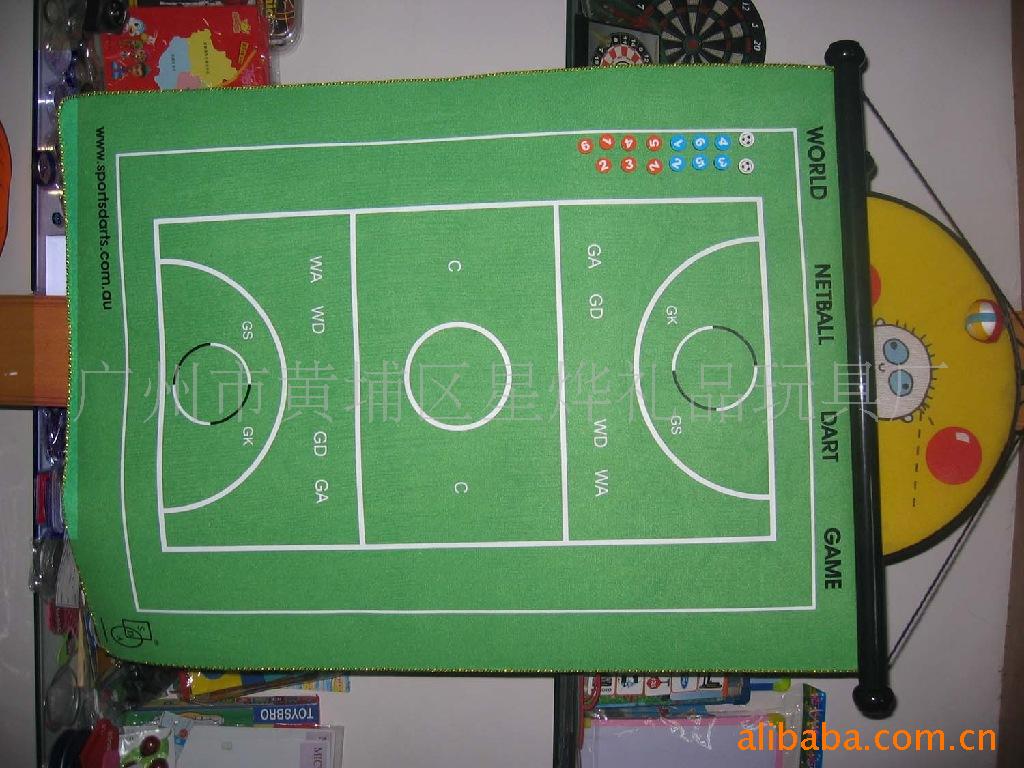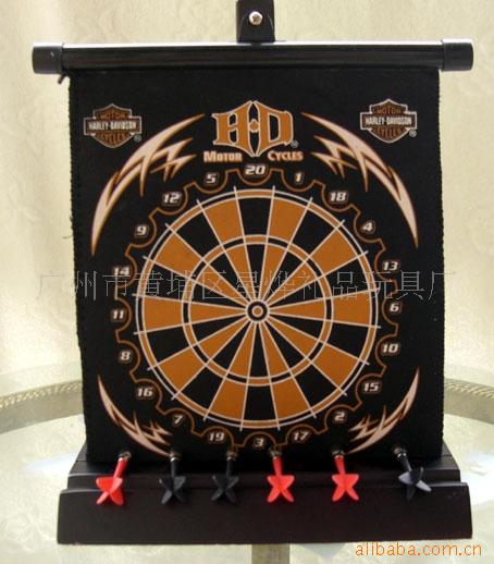 14)绒布飞镖靶:采用双面贴绒布单面或者双面印刷+中间铁粉胶+塑料管条+塑料管头+6支4号全塑飞镖+挂绳