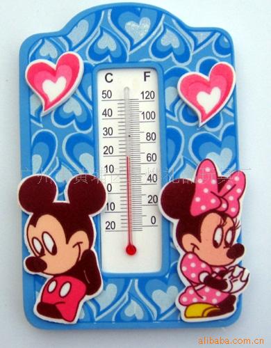 2)温度计冰箱贴:采用下面软胶磁铁+上面铜版纸四色印刷裱光膜+温度计,