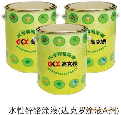 水性锌铬涂料又称达克罗涂料、高克锈涂料.达克罗涂料是银灰色粘性液体,涂液中鳞片状锌铝片是长几微米,宽几微米,厚0.1-0.4微米大小整齐的鳞片状粉末,通过物理、化学作用使之分散在铬酸和乙二醇的水溶液中.常州高克锈表面工程技术有限公司涂料品种见表一.达克罗工艺相关前、后处理剂见表二.
