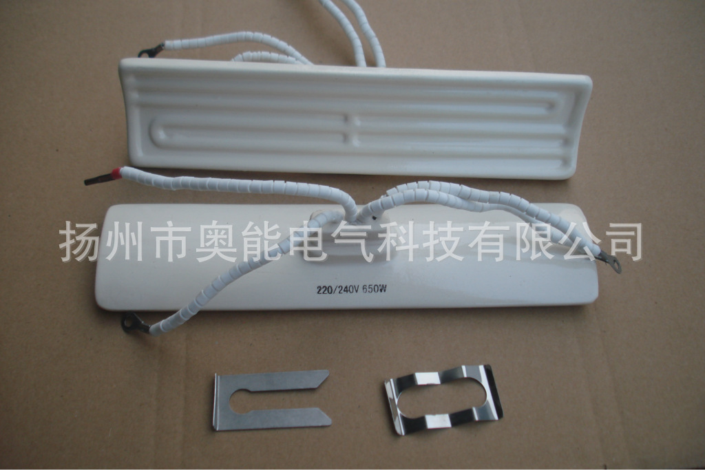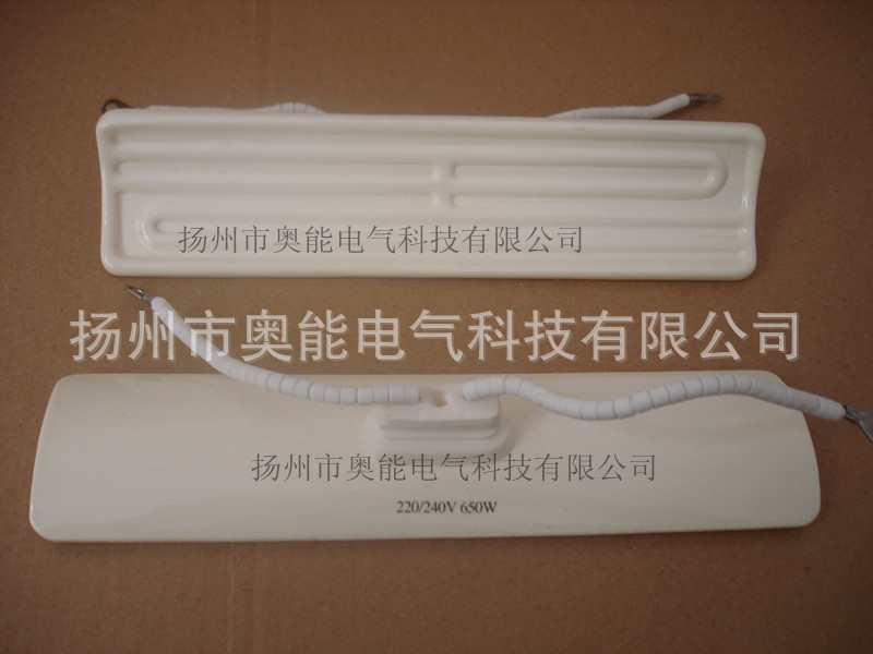 陶瓷加热板(远红外加热板、辐射加热板)元件结构:是采用高辐射率的釉层辐射强度高,热震性能良好的陶瓷材料作基体,高质量的镍铬发热丝一次烧结而成,陶瓷加热板的组成分别如下:1、基体:由热震性好的陶瓷材料组成;2、发热性:由高质量的镍铬合金丝烧制而成;3、釉层:由远外辐射性能好的金属氧化物原料组成并放入适量的添加剂提高辐射强度增强坯釉适应性。陶瓷加热板常用规格:60*60mm,60*120mm,60*240mm,80*240mm,85*245mm,120*120mm,130*130mm,100mm*100mm,100mm*210mm, 200*250mm,200*300mm等。技术参数:1、辐射特性:元件的最高单色辐射率达0.9,法向全辐射率大于0.83,辐射角度180度;2、热响应时间:从室温升至辐射板表面温度恒定值时间不超过20分钟;3、耐冷热交变性:五次冷热交变试验后无剥落、无开裂;4、辐射面温度不均匀度:≤15%;5、功率误差:在额定工作电压下≤5%;6、冷态绝缘电阻:500V兆欧表>2mΩ;7、热态绝缘电阻:500V兆欧表>0.5mΩ;8、国家标准使用寿命≥4000h。陶瓷加热器是根据国际先进技术的指引,加上多年的研究,获得的成果。具有科技含量高、整体性能好、清洁卫生、组装方便、耐酸、耐腐蚀,使用安全、寿命长的特点。用途:可广泛用于真空吸塑、食品烘烤、医疗卫生等各类红外干燥烘烤、固化等场合,在电子纺织、轻工、机电化工、医疗、食品等行业中具有理想的节能效果,有明显的社会效益及经济效益。我厂可根据用户的特殊要求给予非标加工。