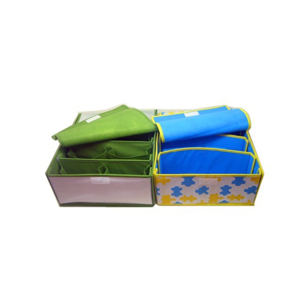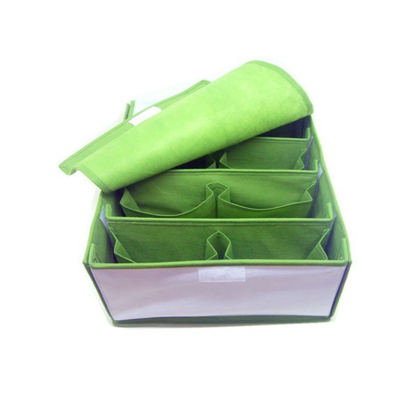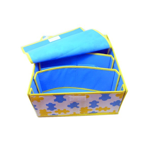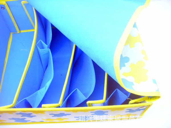 用途:收纳盒有4个格子,可用于收纳纹胸、内衣等小件物品,收纳盒上面有软盖,防止尘埃污染,不需要用上时可折叠起来,不占空间。