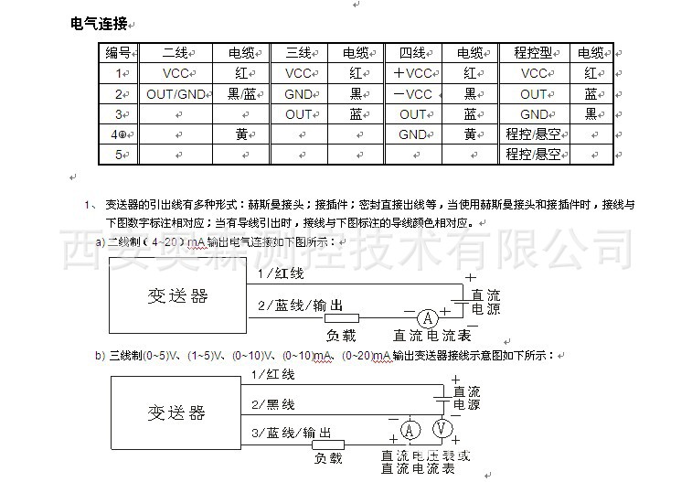 输出信号: 4~20mA;(二线制) 0~5V;1~5V;0.5~4.5V;1~10V(三线制)