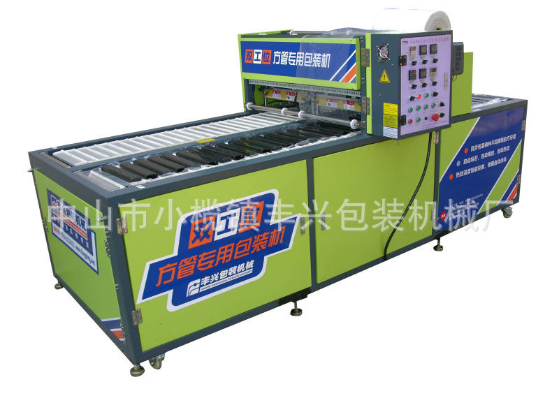 产品说明:双工位方管专用包装机,同步包装两种不同规格的方形管,自动纵封,自动横封,自动热切。热封温度智能控制卷膜自动供料。