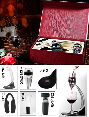 产品名称:大口杯速醒酒器(升级版·礼盒6件套) 产品编号:MX-6C 产品配置:大口杯醒酒器、弧形支架、大底盘、真空酒塞、 倒酒器、割纸器 产品特点: 特点一:产品设计新颍、时尚。红酒里含有“单宁酸”物质,影响红酒口感,因此,红酒在饮用前须醒酒。本品采用伯努利原理,在酒液的进液部和出液部中间设置通气部,酒液从醒酒器上端空腔体倒入,酒液通过时,通气部压力变低,空气通过通气部小孔进入醒酒器内,与液体混合,从而快速醒酒,留住了红酒纯正口感。 特点二:包装精美。产品采用精美包装,并备有多种红酒工具组合在一起,形成一个完整的 礼品套装。是企事业单位送礼品首选。