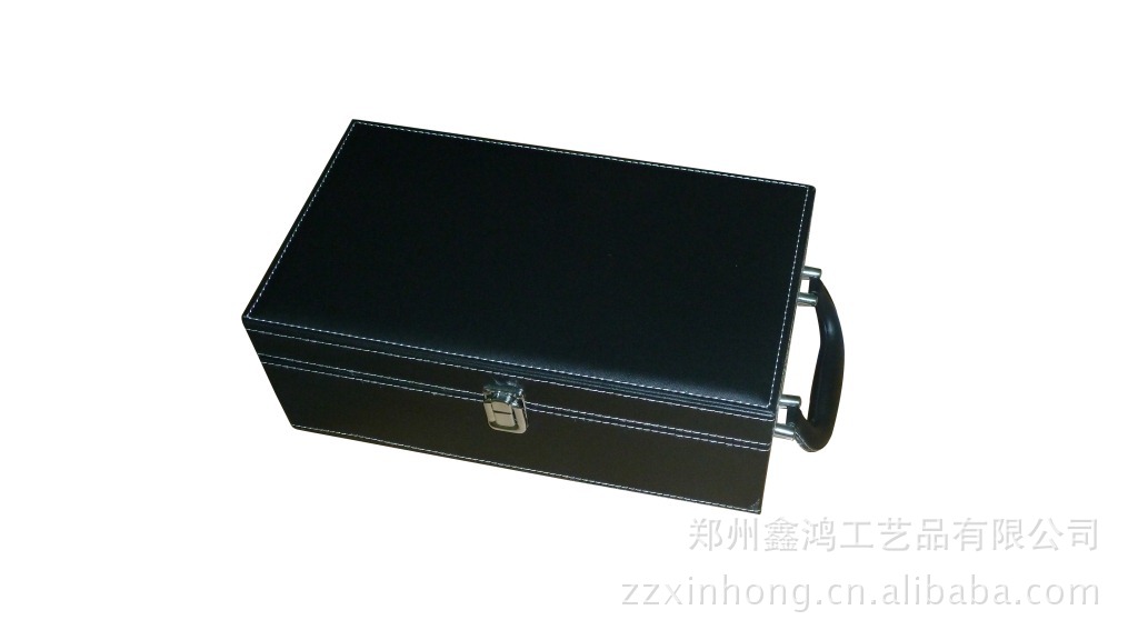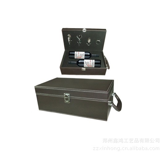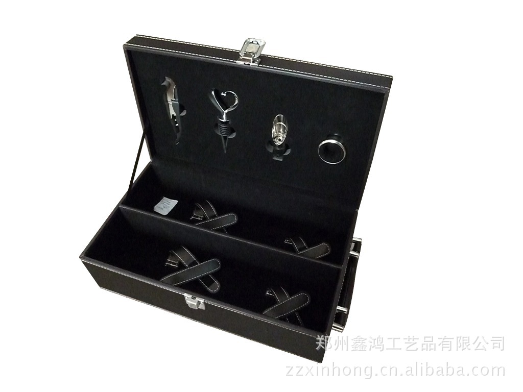 现货 黑色PU 手提红酒皮盒 2瓶装葡萄酒礼品包装盒(含酒具)