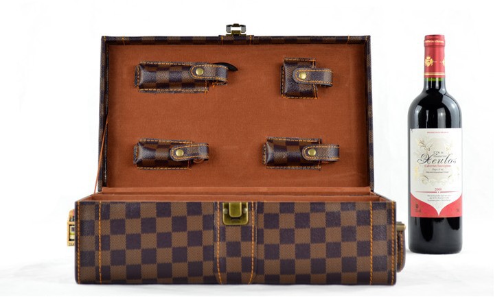 红酒盒双只装 咖啡色格子纹PU红酒皮盒 2瓶装葡萄酒盒(含酒具)