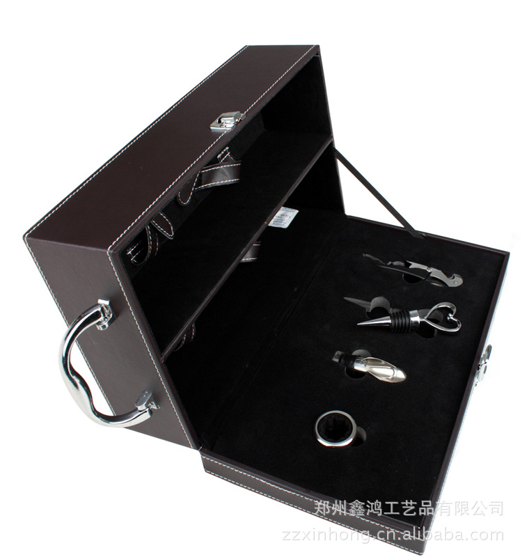 现货 咖啡色银手提红酒皮盒 2瓶装葡萄酒礼品包装盒(含酒具)