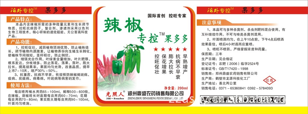 本产品内含辣椒所需的多种微量元素和生长调节物质、控旺抗病因子,螯合剂、渗透剂采用以色列生物工程技术,精心研制的速效超能、无公害高科技产品。