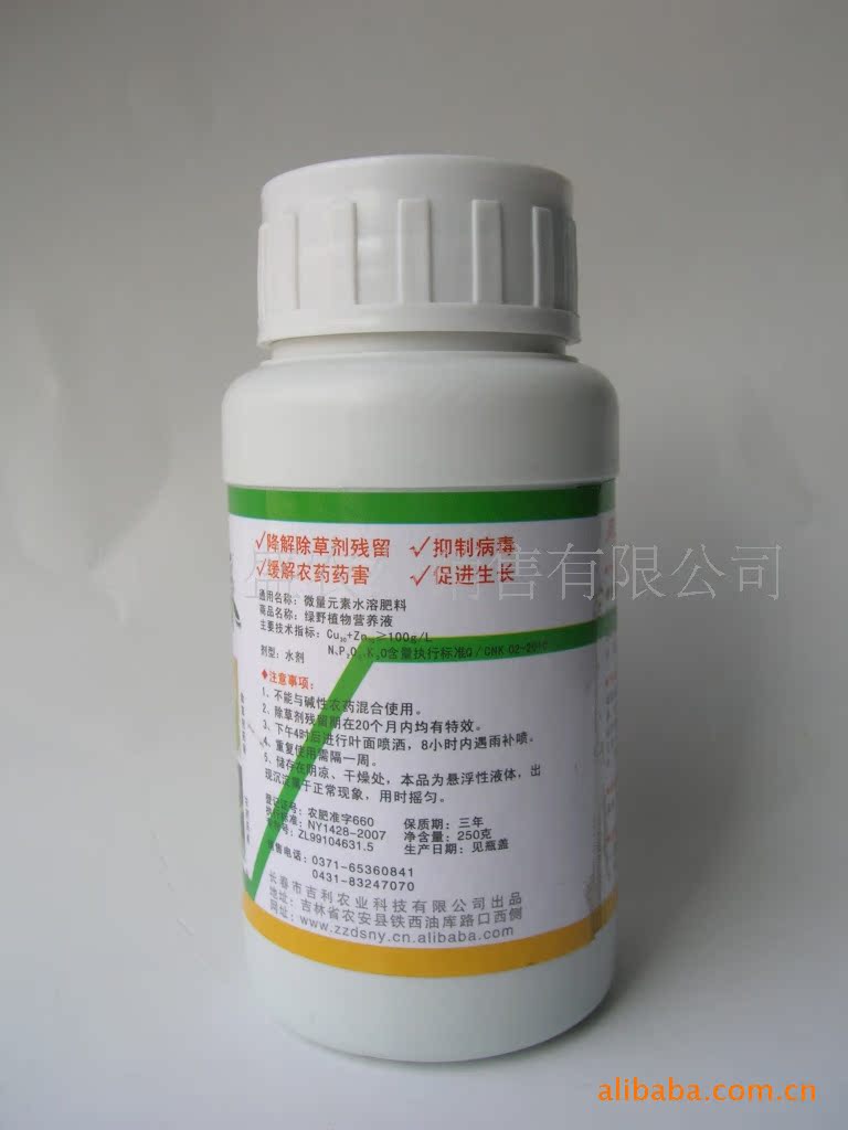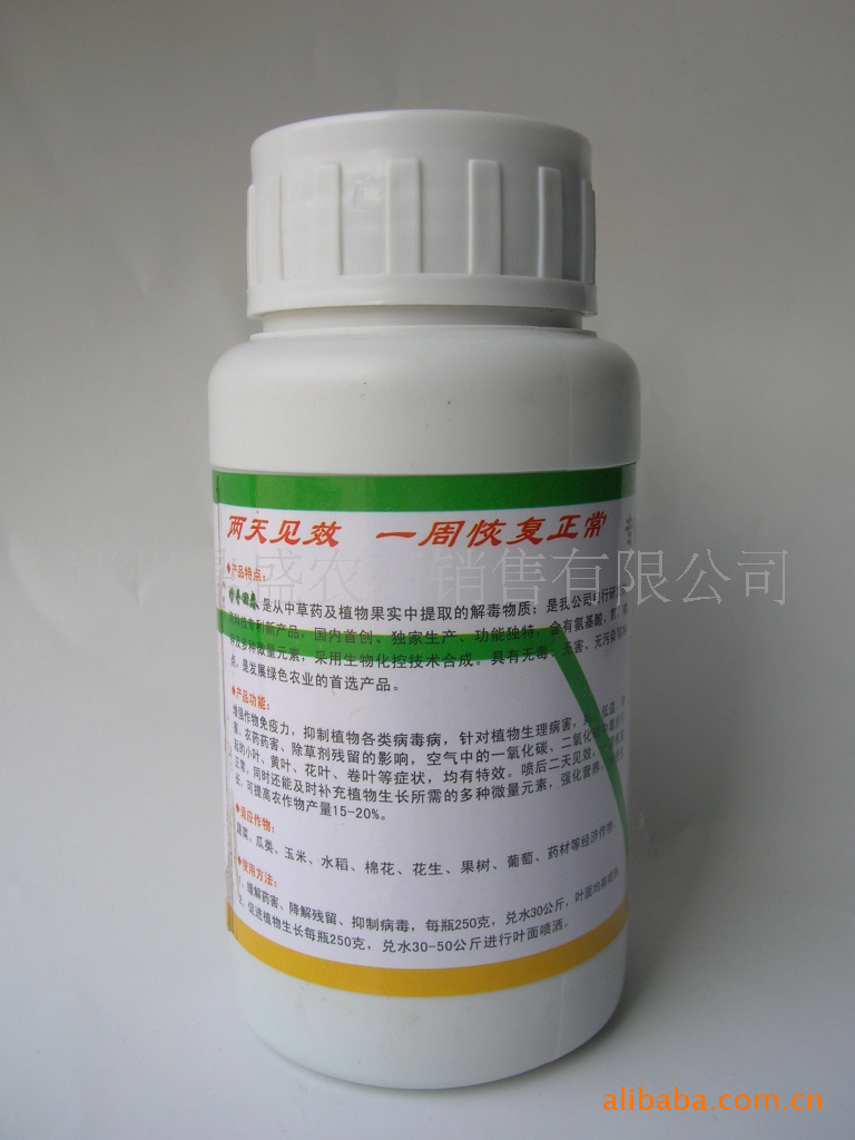 具有解除草剂残留,抑制病毒病,缓解农药药害,防治蔬菜瓜果冻害,促进生长的作用。两天见效,一周恢复正常。