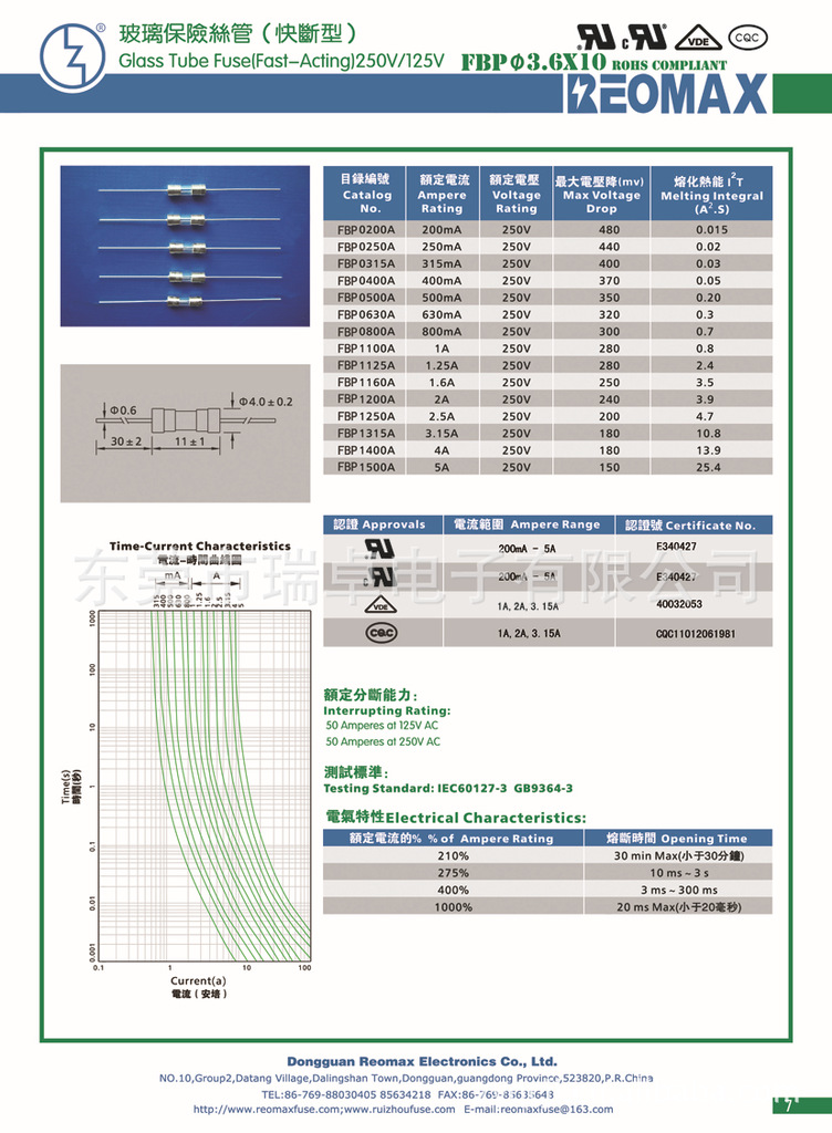 | 3*10全玻封电流保险丝 φ3.6*10mm F100mA-F10A 125V~250V φ3.6*10mm Fast acting fuse | 3SFP双帽快断电流保险丝 φ3.6*10mm F100mA-F10A 125V~250V φ3.6*10mm Fast acting fuse | ||