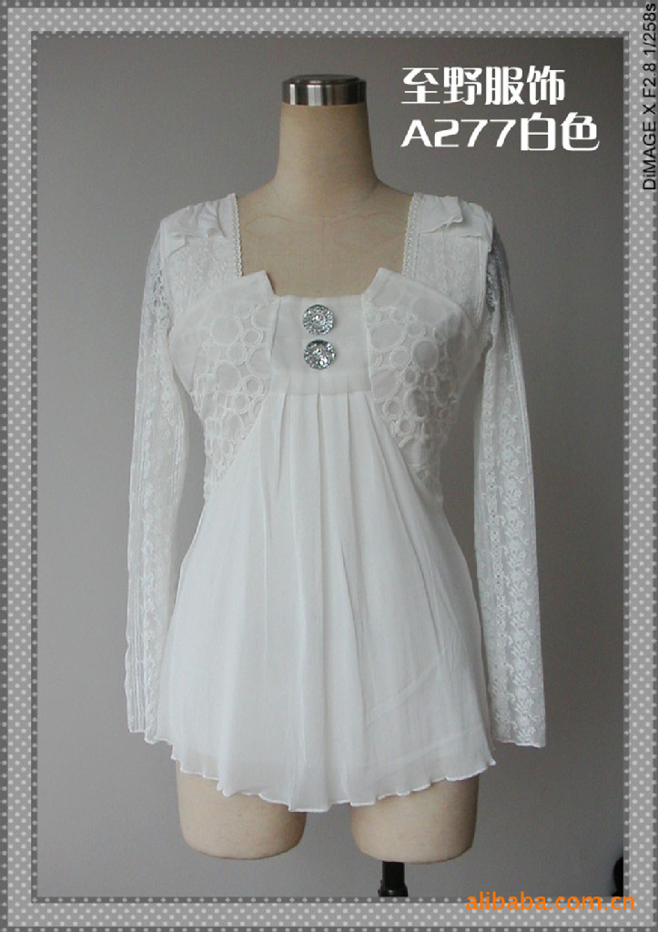 此款式是至野A277款式,此款比较适合秋季穿着,肩部与袖子是蕾丝材料,显得有点紧身,而衣摆以及衣服的腹部部位是雪纺纱材料,显得松身,两部分形成鲜明对比,给人一种与众不同的视觉冲击。衣服的胸部中部镶嵌了两颗钻,左右肩部各方上了一条带子,显得有点像警察服饰,让人感觉标新立异,清新的感觉。