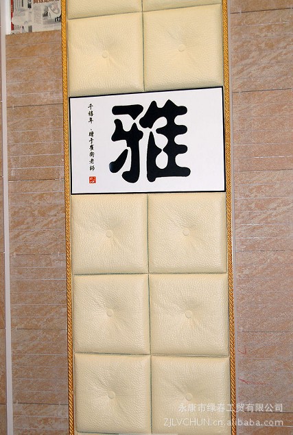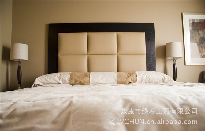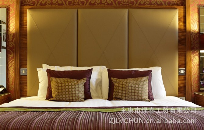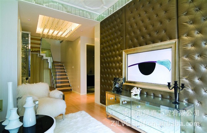 软包是指一种在室内墙表面用柔性材料加以包装的墙面装饰方法。它所使用的材料质地柔软,能够柔化整个空间。除了美化空间的作用外,更重要是的它具有吸音,隔音,防潮,防霉,抗菌,防油,防尘,防静电,防撞的功能。 材料:皮革、绒布、水晶扣、海绵35mm。