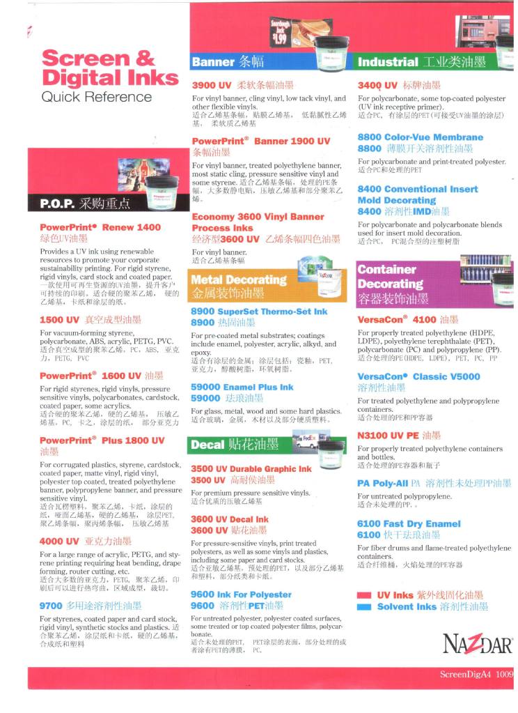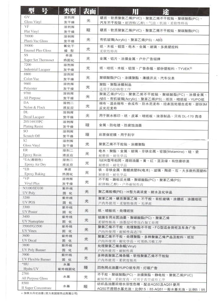 美国丽色达GV系列油墨主要用于户外广告产品PC材料,耐候性好。它有多款透明色和四色油墨。