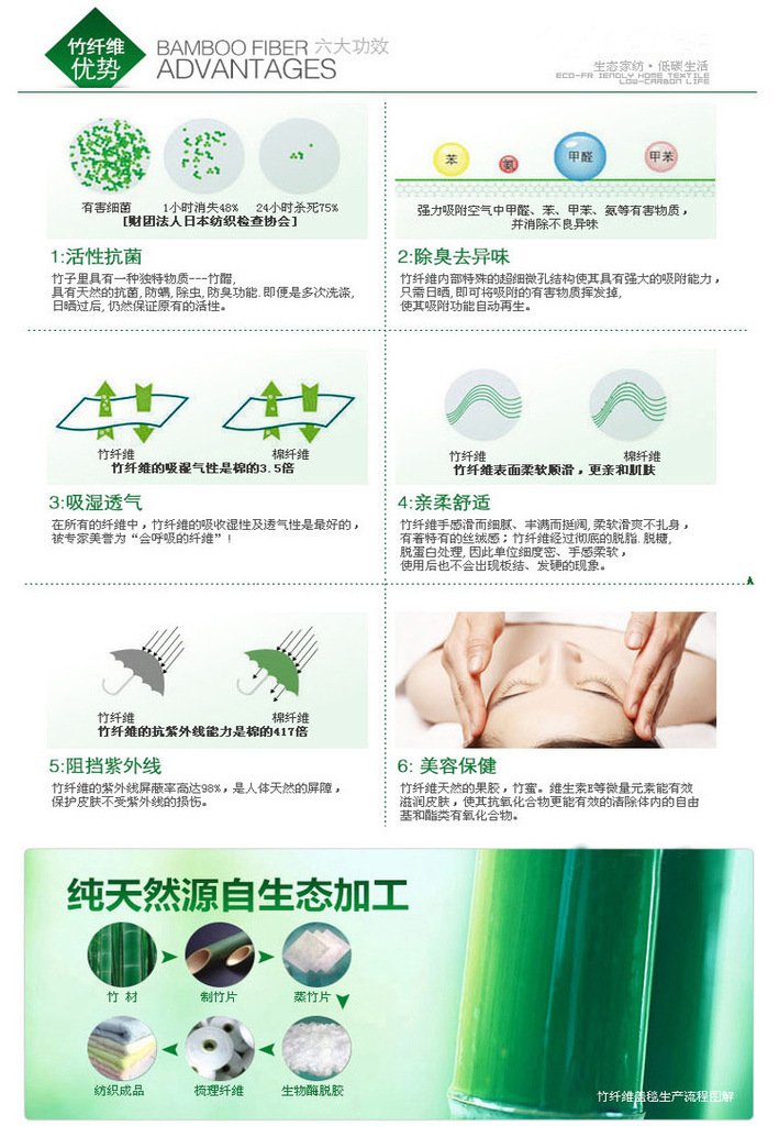 竹纤维不带自由电荷,不会产生静电;富含多种维生素,能改善人体微循环、疏通经络、调节神经。