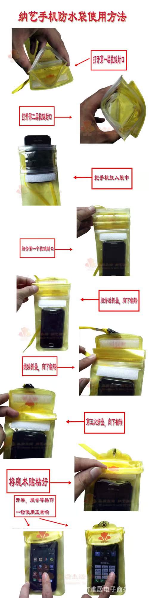 3.在水中使用后,如需要取出东西,请把封口处向下,避免残留的水分进入防水套内。