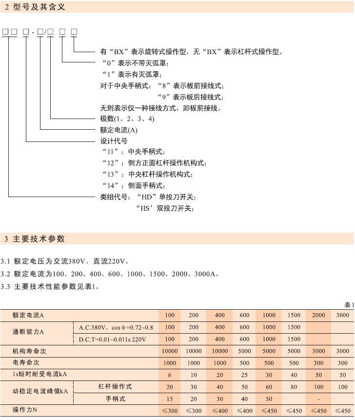 HD系列、HS系列单投和双投刀开关适用于交流50Hz,频定电压380V,直流至440V,额定电流至1500A的成套配电装置,作为不频繁地手动接通和分断交、直流电路或作隔离开关用。其中: