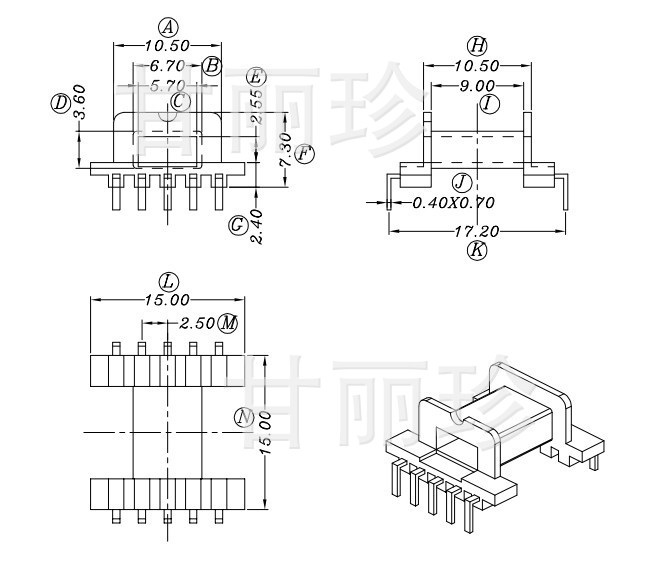 efd15贴片骨架 SMD BOBBIN YT-1502-1 尺寸图 L针 7字针 Soft ferrite core, BOBBIN, Skeleton, ic ring core,Irong core,