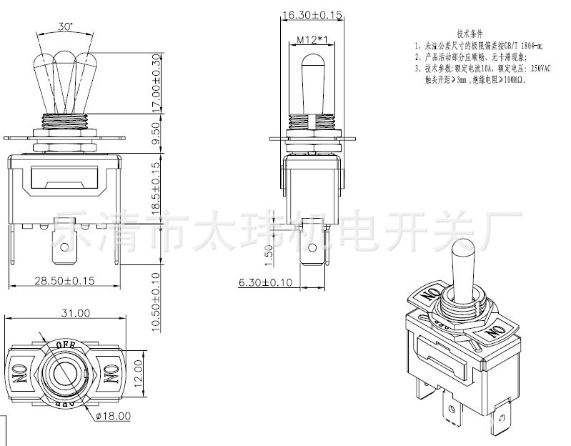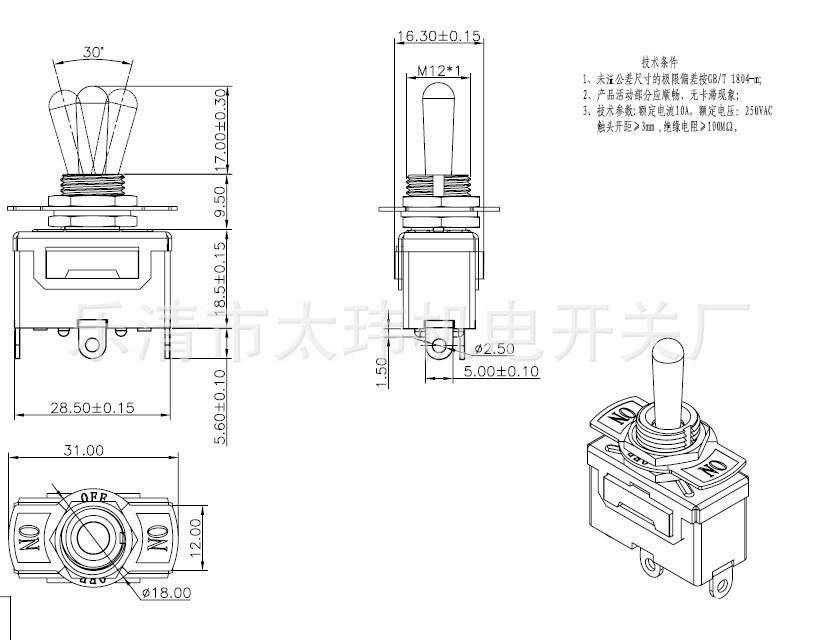 极数 | 1 极SPDT | 安装孔尺寸 | 直径:12.5mm |