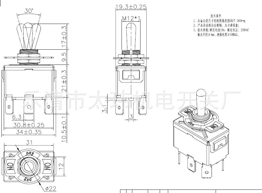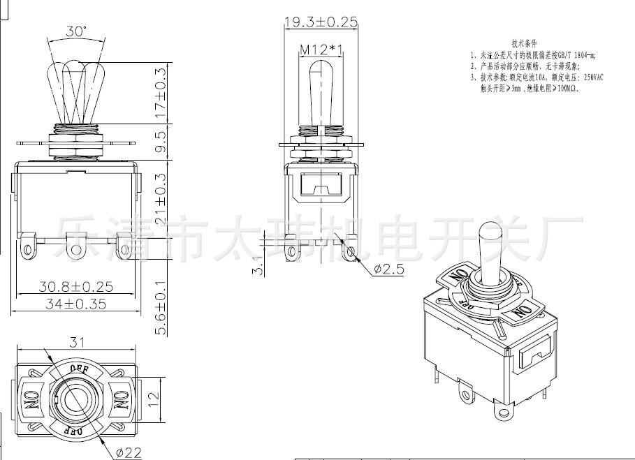 极数 | 1 极SPDT | 安装孔尺寸 | 直径:12.5mm |
