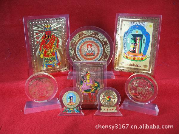 (一)佛教工艺品:七彩莲花灯、烛台、转经轮、如来塔、吉祥挂表、镀金铜版画、高档水晶、有机玻璃工艺品摆件,护身符金卡、生肖金卡、吉祥车挂、佛缘吊坠、法师人像佛卡、镇宅避邪风水物、密宗唐卡、彩卡、佛像镀金挂历、台历、笔筒,金碟、镀金工艺佛像等.
