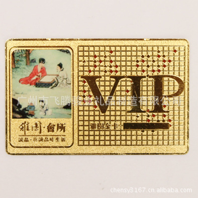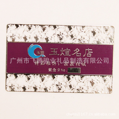 (二)金属卡系列:金属镀金卡、镀银卡、金属条码卡、金属IC卡、金属磁条卡、会员金卡、贵宾金卡、优惠卡、年历卡、代金卡、异型卡、彩色金属卡、彩印卡、丝印卡、纪念金卡、芯片卡、工作证卡、金属佛像卡、金属工号牌、金属胸牌、金卡标牌、金属挂牌、金属标签、金属贴片、金属书签、奖牌、徽章、滴胶胸牌、丝印亚克力胸牌等,各种不同厚度、不同规格、不同造型的卡片,种类近百种。