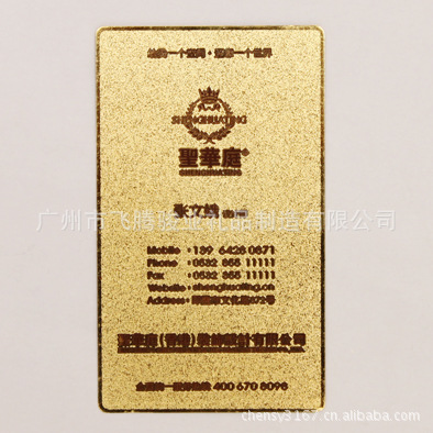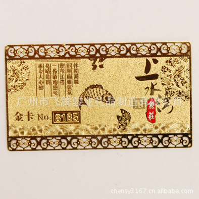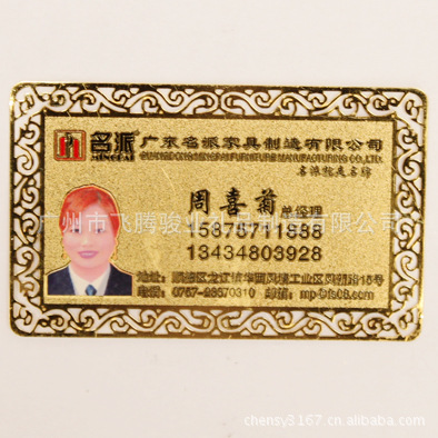 广州市飞腾金卡是一家专业生产各种金属卡的大型生产基地,拥有12年丰富的卡片生产经验,引进先进的生产设备和技术,月生产能力达到100万张。公司专业制作生产各类金属镀金卡、镀银卡、金属条码卡、金属IC卡、金属磁条卡、会员金卡、贵宾金卡、优惠卡、年历卡、代金卡、异型卡、彩色金属卡、彩印卡、丝印卡、纪念金卡、芯片卡、工作证卡、金属佛像卡、金属工号牌、金属胸牌、金卡标牌、金属挂牌、金属标签、金属贴片、金属书签、奖牌、徽章、滴胶胸牌、丝印亚克力胸牌等,各种不同厚度、不同规格、不同造型的卡片,种类近百种。经过我们多年以来不懈的努力,业务遍及全国各地的银行、电信、邮政、服装、超市、教育、医疗、交通、旅游等领域。产品得到广大用户的一致好评。