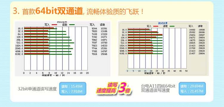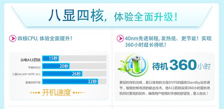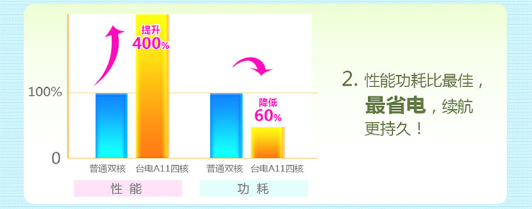 八显四核性能的巨大提升,然而功耗却比双核更低,如果将速度平均到处理器所消耗的每瓦功耗上,也就是在费同样多电的情况下,A31四核处理器效率提高150%。此外,台电A11四核特别为此次打造了智能PMIC电源管理,支持无级DVFS和超级Standby动态调节,智能控制电流的输出,能达到长达360小时超长待机,让续航更持久,并支持快速充电技术,方便使用!