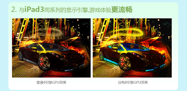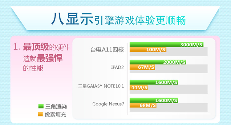 台电A11四核能流畅地玩转数十万个Android免费游戏,无论是《水果忍者》、《愤怒的小鸟》这样的热门游戏,还是《都市赛车》、《使命召唤》等大型3D巨作,都能轻松运行。同时OFFICE文档处理、电子邮件等商务需求也应有尽有。10.1英寸屏幕非常适合阅读新闻和杂志,而Android平台中海量的书籍、杂志,让你轻松的获取任何想阅读的书籍。