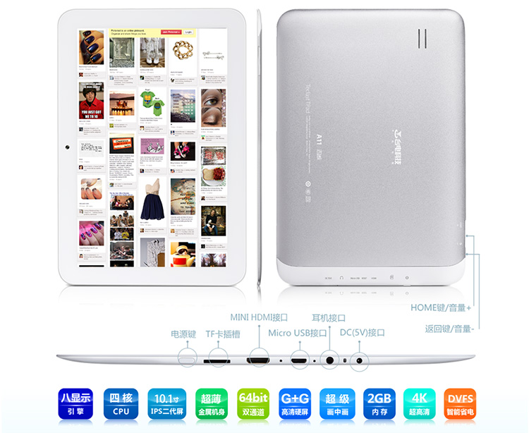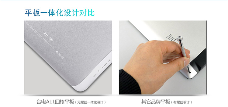 台电A11四核采用更加时尚的白色面板设计,相对黑色更具时尚气息!A11四核采用无螺丝超轻薄一体化设计,外形简洁大方。机身厚度足足比同类产品薄20%以上!你能随手找到并开始使用它,上网查询信息、收发邮件、看视频玩游戏等等,随时随地都能享受到平板带来的便利与乐趣。而且A11四核机身采用特殊轻质合金精密打造,确保了纤薄的机身也具有惊人的结构强度与牢固性。即使在恶劣的环境下使用,全金属的机身也能完好的保护机器元件不受损坏。金属机身磨砂的表面处理结合超薄设计,使A11四核显得精致有型,充满时尚感。