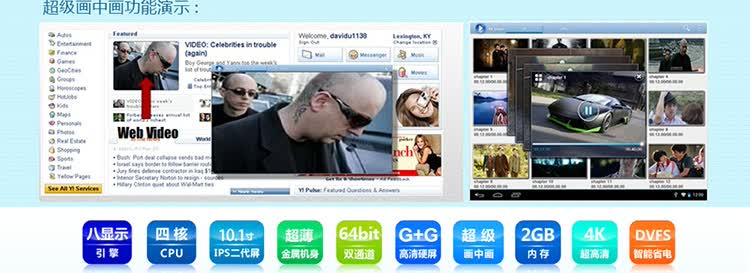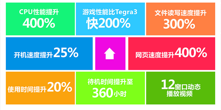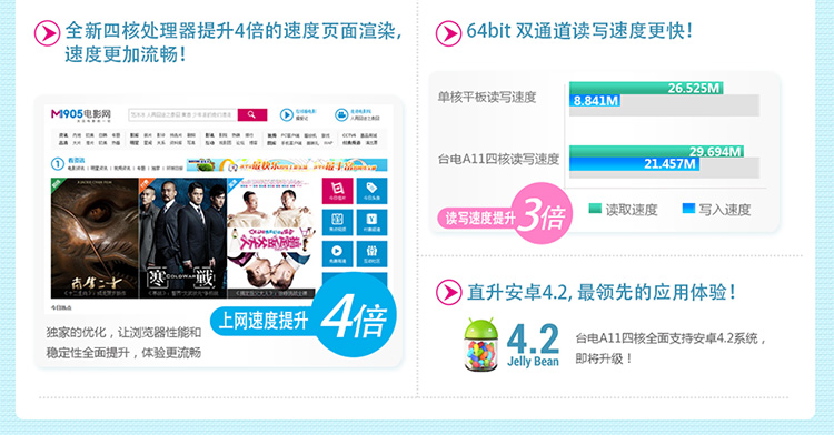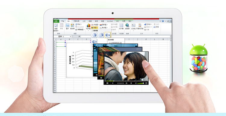 (果冻豆)的安卓4.1智能操作系统,该系统是目前最为先进的安卓系统版本。安卓4.1系统使用了新的处理架构,Android设备中出现的四核处理器能得到更好的优化,发挥出强劲的性能表现。支持视频预览,并加入超级画中画功能,你可以在玩游戏、上网、阅读的同时观看自己喜欢四部电影或是电视剧,让平板的可玩性大大提高,更支持目前最为领先的安卓4.2系统,体验即将全面升级!