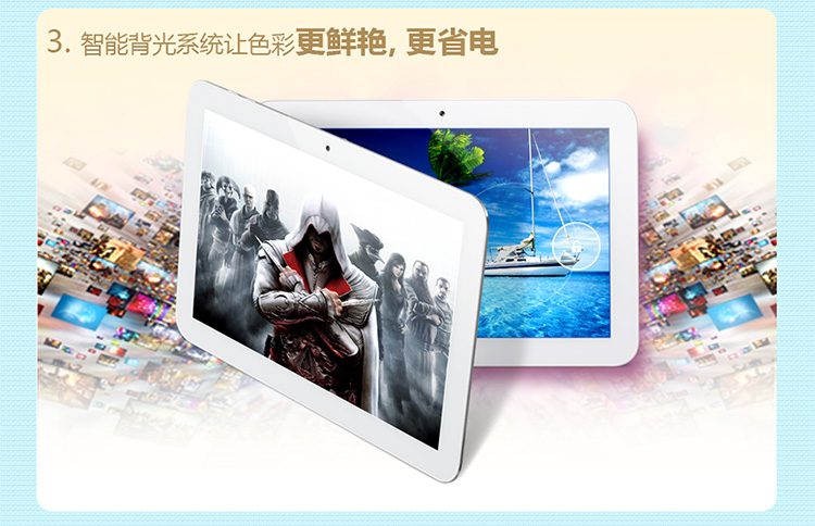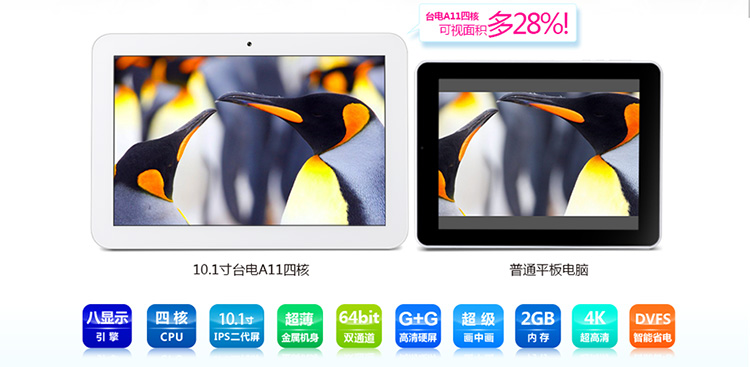 大屏平板电脑的主要屏幕规格均以9.7寸4:3的方屏为主。这种屏幕在播放标准的720P、1080P电影时,会有较大的黑边。而台电A11四核采用10.1寸IPS超宽屏,并且分辨率高达1280×800!IPS硬屏技术是目前世界上最领先的液晶技术。与传统软屏液晶相比,IPS硬屏液晶具有响应速度更快、图像无残影、响应速度均匀、色彩无偏移、178度全向可视的特点。观看图片或视频的清晰度更高,细节更丰富,是目前平板电脑屏幕中的佼佼者。台电四核完美匹配720P、1080P视频比例,看电影无黑边!可视面积比采用9.7寸方屏的IPAD2足足多28%!无论是观看电影、浏览图片、浏览网页、玩游戏均有更为震撼的感觉