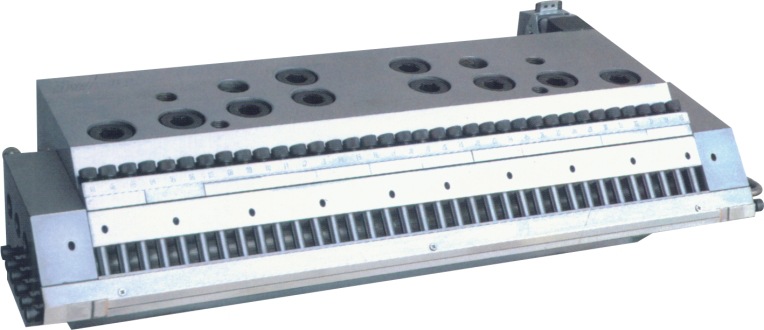 在模唇部可得到连续挤出无阻拦的流面,90度调节阻流棒调节装置,能够满足不同厚度制品的需求,上下模唇可调节厚度,模唇可更换。
