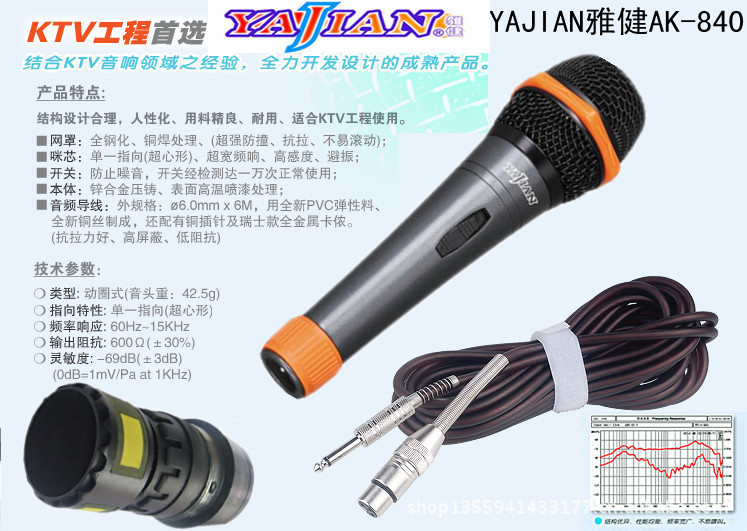 广东省恩平市专业有线无线麦克风制造商,有线无线麦克风,YAJIAN雅健AK-840有线麦克风,适合家庭,KTV,工程,实况演唱,等场合使用,效果好,质量保证,精工打造。如购买本店产品的客户,7天内发现本店产品有质量问题的情况下,本店承诺给购买者无条件退换