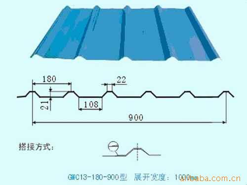 900型彩钢瓦是近年国际、国内兴起的一种新型建筑材料,900型彩钢瓦具有轻质高强度,美观耐用(使用寿命15~20年),抗震性好,施工快捷简便,热反射性高、热发射性低因而隔效果显著等特点,适合于工业及民用建筑之屋面板、墙体板和楼层板等,特别适用于大跨度厂房、粮库、仓库等。