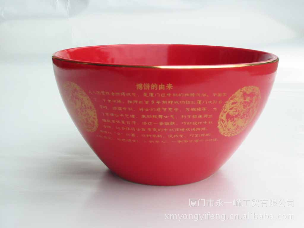 永一峰陶瓷是专业博饼碗,研发、制造商!自2004年开始年年赞助厦门日报,海峡导报的厦门市城市博饼节,为厦门著名的月饼厂商开发设计,制造专属品牌的博饼碗,状元碗,六年开发了中国红状元碗:4.5寸伴手礼,7寸家博碗,9寸富贵碗,12寸吉祥碗,16寸高升碗,18寸状元红碗,1米的世博碗。产品荣获全国多次荣誉。北京,上海,青岛,南宁,。台北,菲律宾,新加坡等,我们的产品正在更广泛的影响世界。